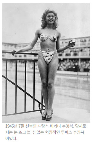 1946년 7월5일. 프랑스 디자이너 루이 레아르가 투피스 수영복을 선보였습니다. 기존 원피스 수영복과 달리 상의와 하의가 분리된, 노출이 심한 수영복이었습니다.